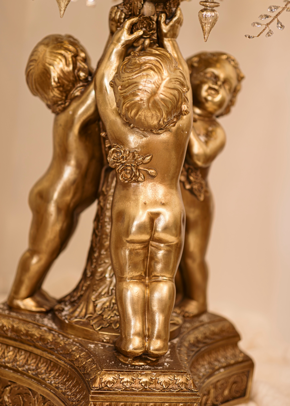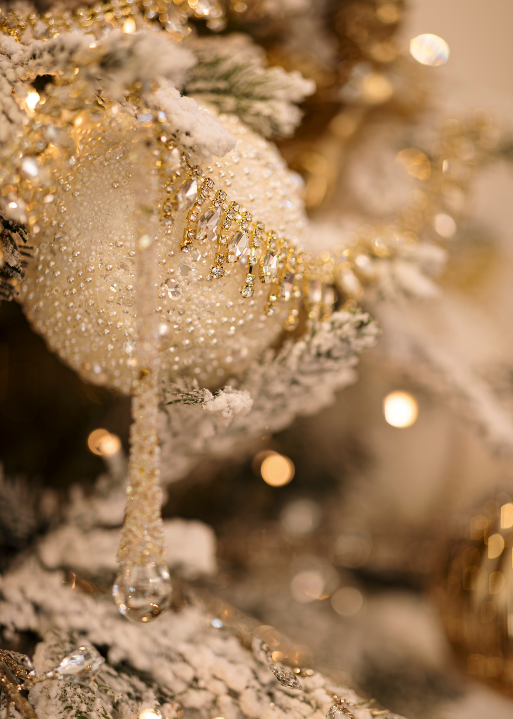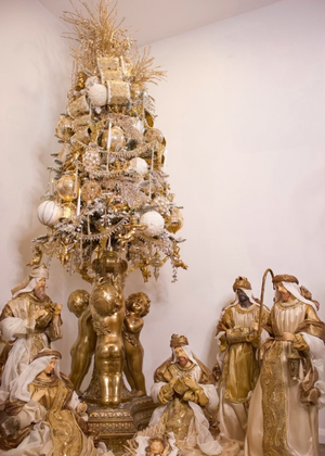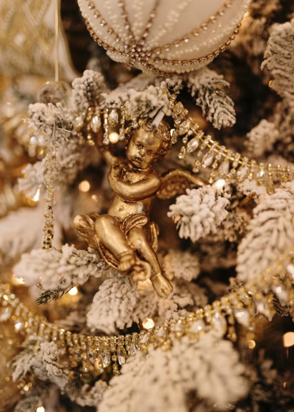 • Types of decorations: Gold and champagne glass ornaments, crystal garlands, LED candles, premium ribbons, and angelic cherub feature pieces.