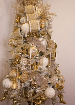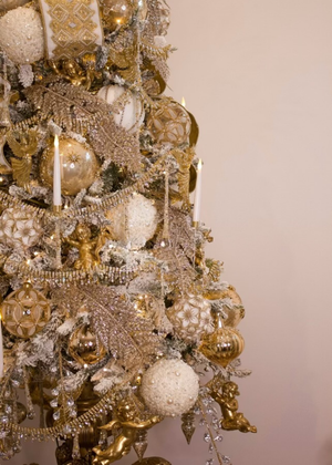 Bathed in gold and kissed with light — the Heavenly Elegance tree embodies divine sophistication. Layered with crystal garlands, gold-trimmed ribbons, and ornate cherub accents, this breathtaking design captures the spirit of grace and grandeur. A true statement piece for those who adore a lavish, heavenly Christmas aesthetic.